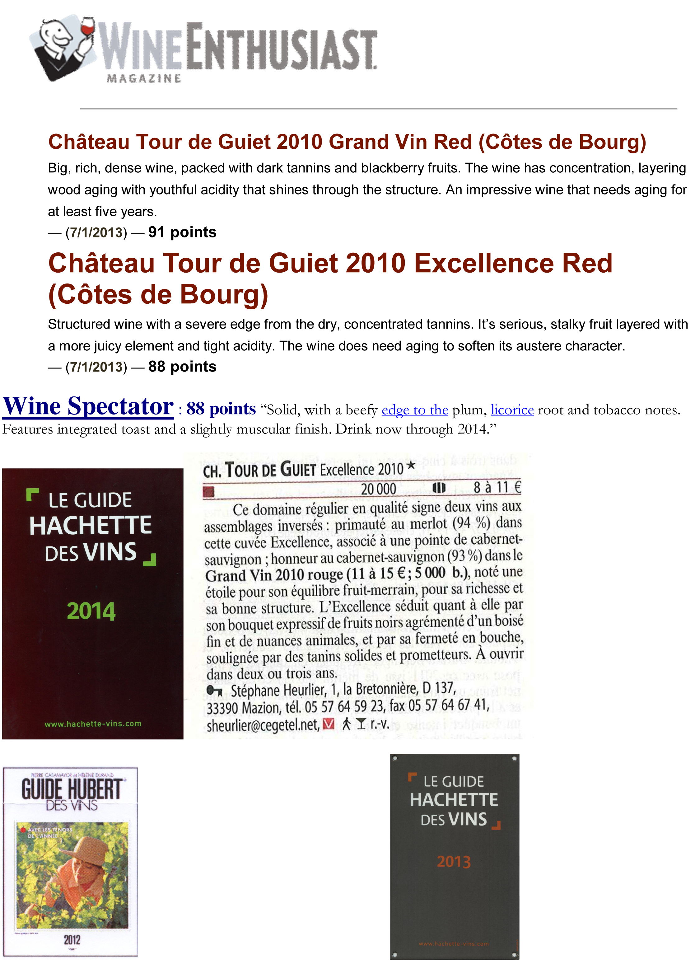 Château Tour de Guiet toujours présent dans les Guides Hachette et Hubert en 2012, 2013 et 2014. Une très bonne note attribuée au Grand Vin Rouge et à la cuvée Excellence par The Wine Enthusiast Magazine ! juin 18, 2014juillet 7, 2014 / sheurlier